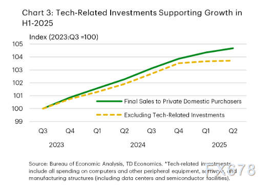 我们长期认为,自2022年启动的数据中心与半导体设施建设潮将在项目临近完工时大幅推动设备支出,如今这一判断正在应验。据我们估算,2025年上半年科技相关项目支出为GDP贡献0.7个百分点,且未来数年可能持续形成顺风动力。若剔除该贡献,衡量核心经济活动的关键指标——国内私人购买者最终销售,上半年将零增长,这印证了经济其他领域缺乏增长催化剂(Chart3)。我们预计2025年下半年经济增长将放缓至1%左右,全年均值降至1.7%(略低于趋势水平,较2024年的2.8%显著下滑)。