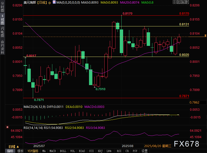 0.8131被视为一个重要的近期阻力位,果断突破该水平可能测试0.8170(8月1日高点)甚至更高水平打开空间。