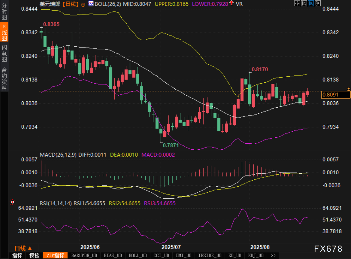 根据最新的技术图表,美元/瑞郎在0.8100一线遇阻,但依然维持在0.8090的支撑水平附近。从图表来看,布林带的中轨为支撑位置,当前价格在其上方整理,显示出一定的上涨动能。