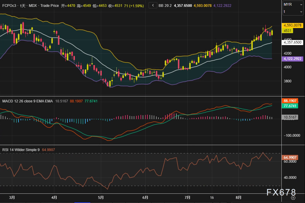 盈凯外汇官网报道——周五(8月22日),马来西亚衍生品交易所(BMD)棕榈油主力合约FCPOc3收报4531林吉特/吨,单日涨幅1.59%,周线累计上涨1.32%,实现连续第三周收阳。盘中价格波动区间贴合技术分析预期,日内突破布林带中轨(4357林吉特)后向上轨(4593林吉特)试探,RSI指标位于64.99,显示市场情绪偏强但未进入超买区间。