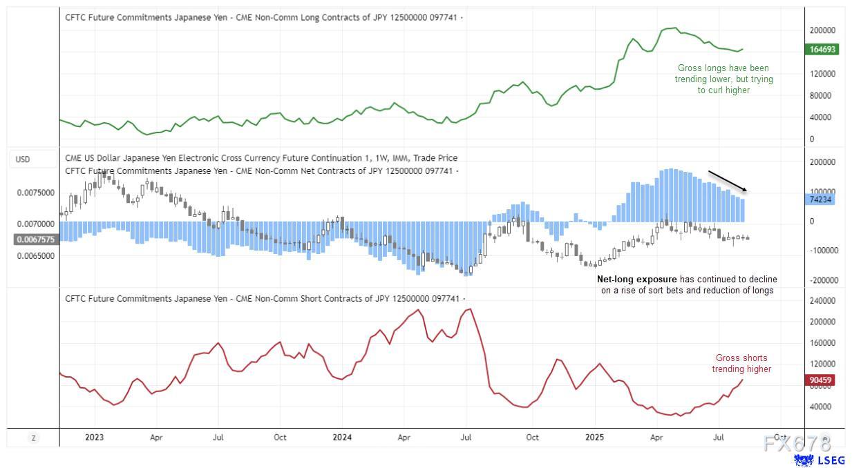 此次持仓转变恰逢市场对日本央行短期紧缩预期降温。然而,随着四季度临近,日元多头可能开始重新活跃。事实上,上周大型投机者的日元净多头头寸已出现小幅增长,且整体净多头头寸仍保持完好。