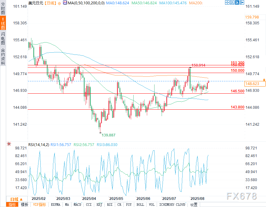盈凯外汇官网报道——7月日本通胀数据略高于预期,进一步引发市场对日本央行(BOJ)最早可能在10月加息的猜测。尽管日元近期表现疲软,但随着美联储政策预期转向鸽派、日本央行紧缩政策临近,市场持仓结构与宏观动能或迎来转变。当前美元/日元仍在关键阻力位附近高位震荡,但从长期视角看,四季度日元有望走强。