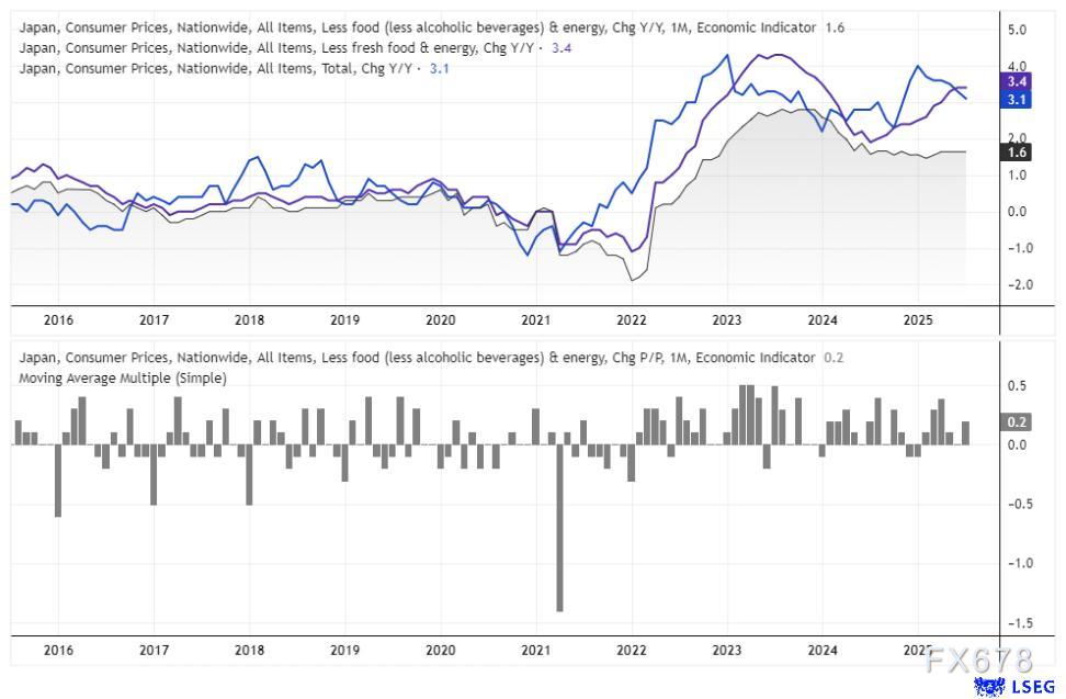 日本通胀数据略高于市场预期,但未必会促使日本央行立即加息。全国CPI同比上涨3.1%,仅略高于3.0%的预期值,且低于6月3.3%的涨幅。核心核心CPI(剔除生鲜食品与能源)已连续四个月稳定在同比1.6%,不过7月环比上涨0.2%。