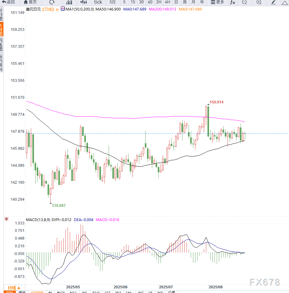 上方148.50至149.00区域为主要阻力区,若价格企稳并突破该区间,则有望重新开启上涨通道。整体而言,技术面显示美元兑日元进入整理阶段,方向选择取决于政治风险与美元走势。