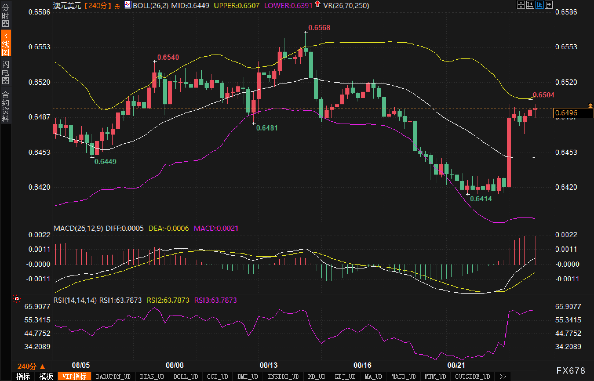盈凯外汇官网报道——周一(8月25日),北美时段澳元/美元围绕0.6500关口企稳,早前受杰克逊霍尔年会后续影响,汇价延续反弹动能。盘面显示,市场在消化美联储主席鲍威尔的鸽派表述之际,风险敏感货币的相对吸引力提升,澳元保持对美元的温和优势。