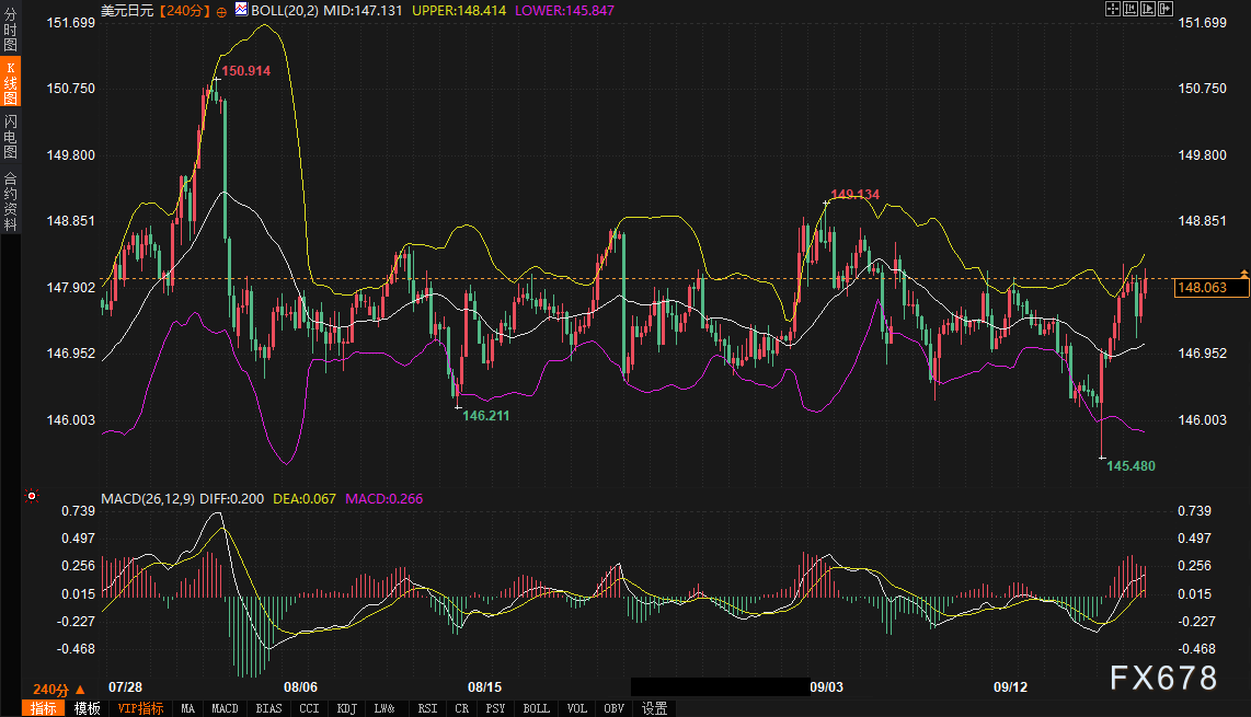 美元兑日元240分钟图表显示强势震荡格局。当前交投于布林带中轨147.131上方,逼近上轨148.415。MACD指标DIFF线(0.201)高于DEA线(0.067),金叉形态在零轴上方延续,表明多头动能占优。关键支撑位在147.131-147.500(布林带中轨与21日均线重叠),阻力位在148.415-149.134(布林带上轨与前高)。