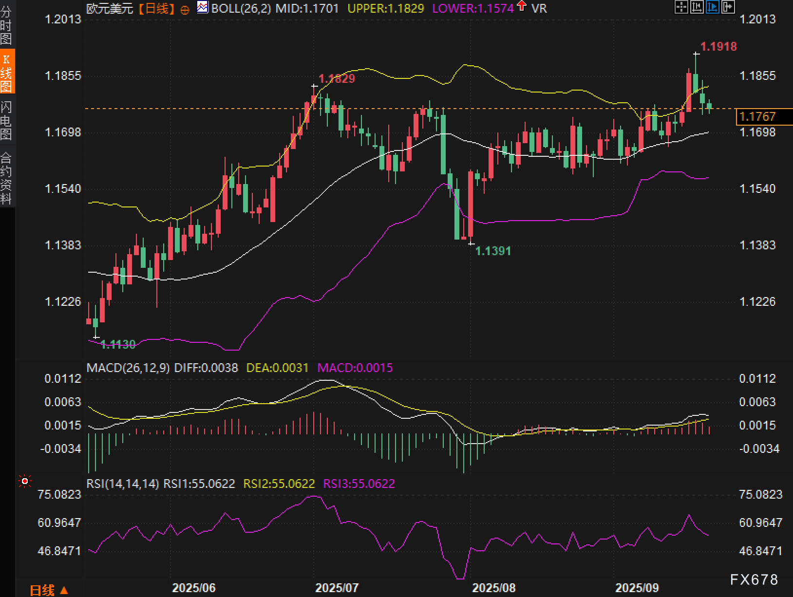 盈凯外汇官网报道——周五(9月19日),欧元兑美元连续第三日下行,欧洲时段交投于1.1760附近,较本周早些时候上冲1.1900上方后回落明显,日内波动以回撤为主,市场在关键均线附近进行再平衡。行情背景指向:美元偏强,但上涨弹性受政策预期所限;欧元受情绪扰动与官员表态牵制,汇价在1.17—1.19区间内部攻守转换加速。