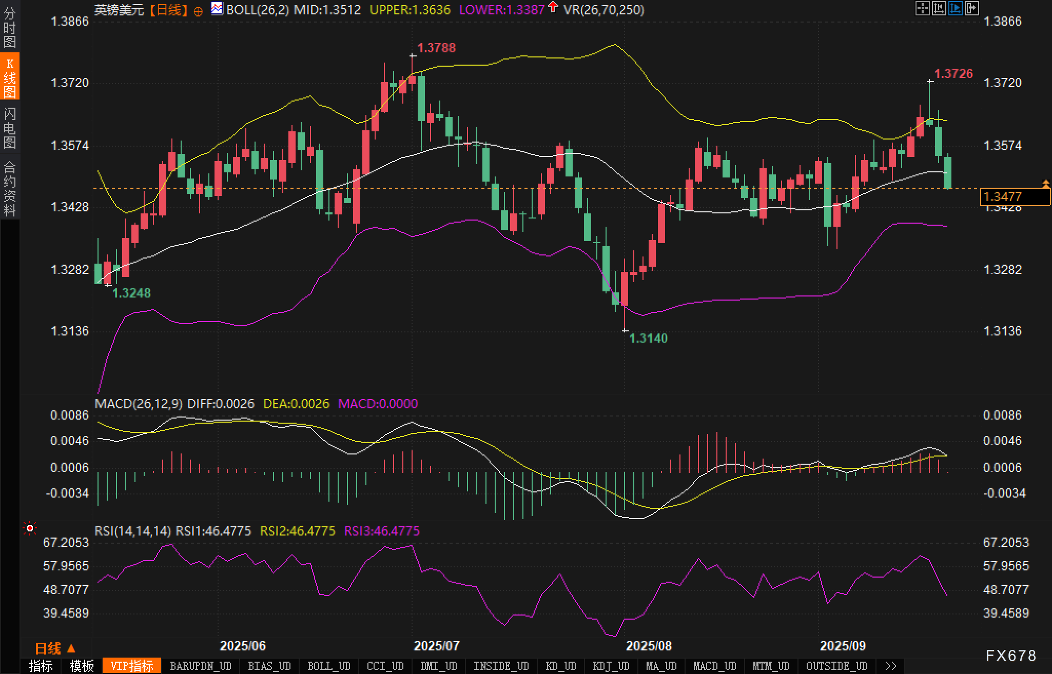 就结构位而言,1.3512中轨已由动态支撑转化为阻力;下方首要关注1.3387(布林下轨)作为第一支撑,若失守,低点1.3140可能被回测。上行方面,1.3512为短线多空分水岭,上破并企稳方能重启均值回归向上,更高阻力依次看1.3636与1.3726—1.3788密集区。