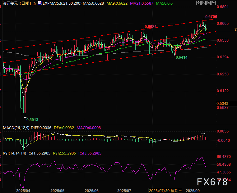 上行方面,澳元兑美元汇率目标或指向9日指数移动平均线即0.6622附近。若突破该水平,短期价格动能将得到改善,有望推动该货币对向9月17日创下的11个月高点0.6706靠近,随后将挑战上升通道上轨,该位置约为0.6710。