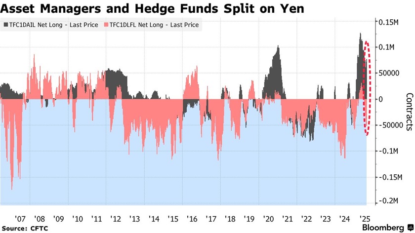 美国商品期货交易委员会(CFTC)的每周数据显示,本月买入日元的资产管理公司与卖出日元的杠杆基金之间的差距扩大至2007年以来的最高水平。
