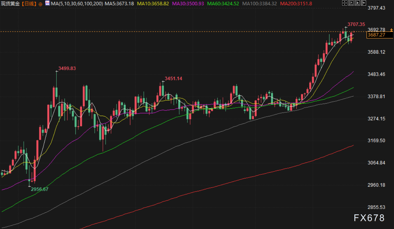 美联储将其关键利率下调了25个基点,但同时对持续通胀发出警告,这使人们对未来宽松政策的步伐产生怀疑。该决定公布后,现货金价格创下3707.40美元的历史新高,随后在震荡交投中回落。RJO Futures市场策略师 Bob Haberkorn 说,黄金在这里仍然相当强劲,只是在美联储之后出现了暂停。看涨趋势依然完好,创新高已成必然,现实层面而言,我们很可能在年底前高见4000美元。
