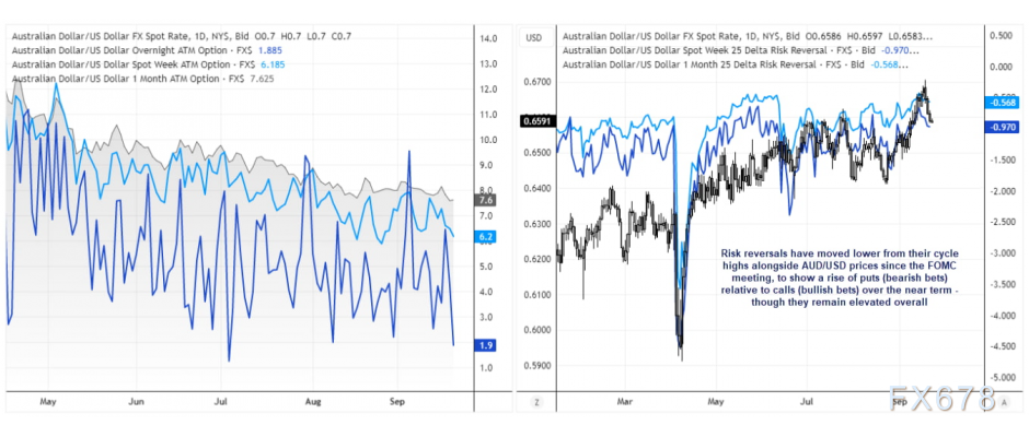 盈凯外汇官网报道——澳元承压下行,因美联储鸽派幅度不及预期推动美元重拾涨势,澳元兑美元此前连续三个交易日走低,周一(9月22日)亚市时段于0.6590附近震荡。风险逆转指标显示市场对澳元的看空押注正在增加,而隐含波动率持续温和下滑。本周焦点集中在澳大利亚CPI和PMI初值,以及美国PCE通胀数据,这些都将决定澳元兑美元会延续跌势还是获得支撑。