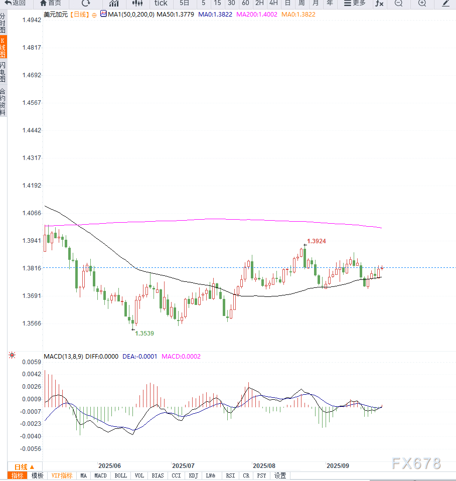 USD/CAD日线图显示,价格在1.3800附近获得支撑,短期维持上涨趋势。若继续上行,阻力位可关注1.3850—1.3880区间;下方支撑则在1.3800与1.3750区域。