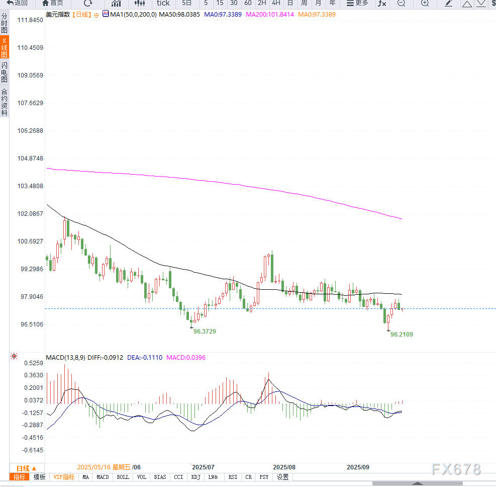 美元指数在97.30附近震荡整理,日线图显示价格仍运行在50日均线上方,短期维持偏强格局。若指数能够稳固在97.20上方,预计将继续挑战97.80—98.00的阻力区间;
