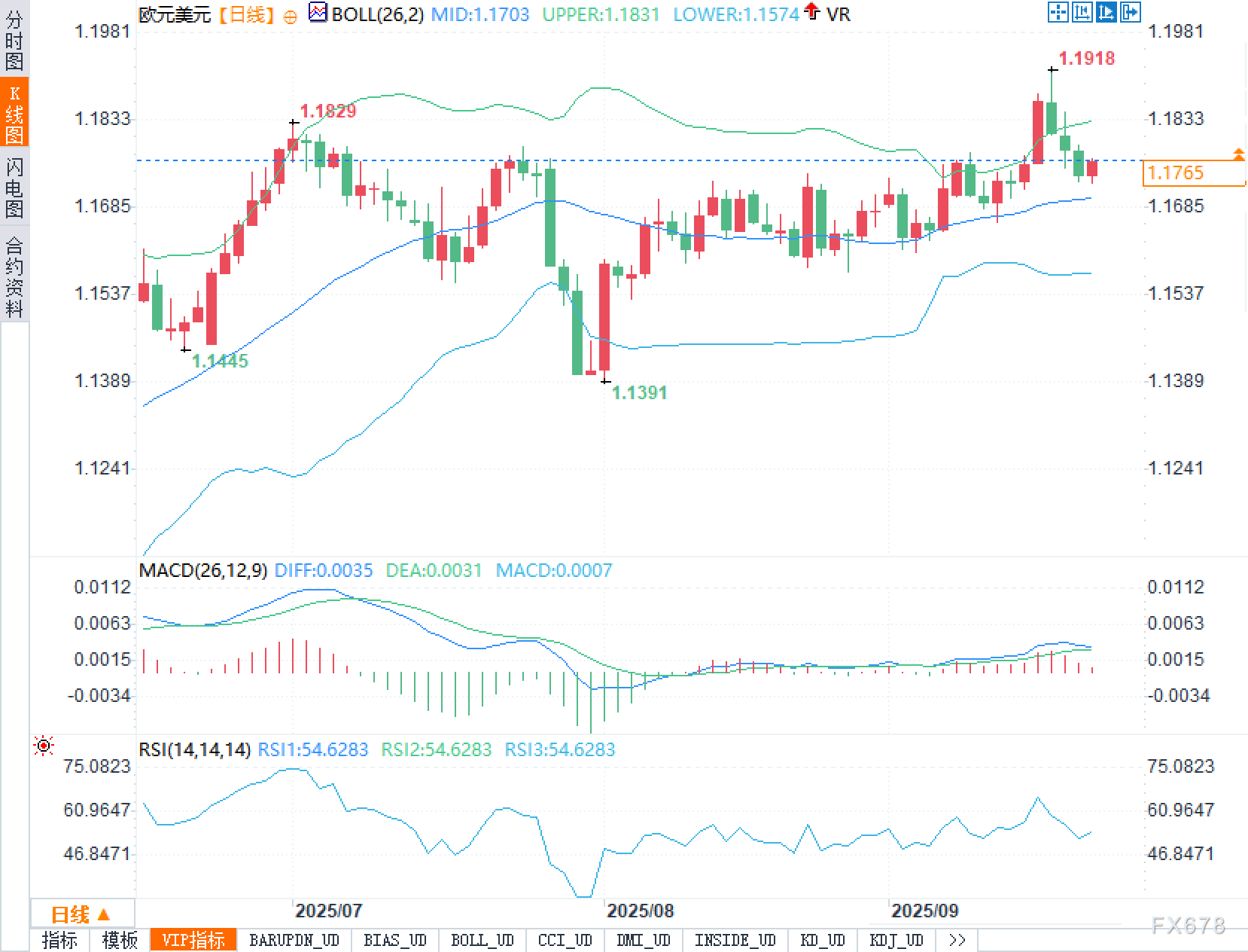 日线图显示,布林带中轨位于1.1703,上轨在1.1831,下轨在1.1574。当前价1.1765运行于中轨之上但距离上轨仍有空隙,表明反弹尚处“修复区间”,并未触发强趋势的带外推进。近期K线上影与下影交替,反映多空在上轨—中轨之间反复博弈;前高1.1918仍是阶段性天花板,其上方若无放量(价量配合)与布林带带宽同步扩张,易出现假突破后回撤的“上冲回落”结构。
