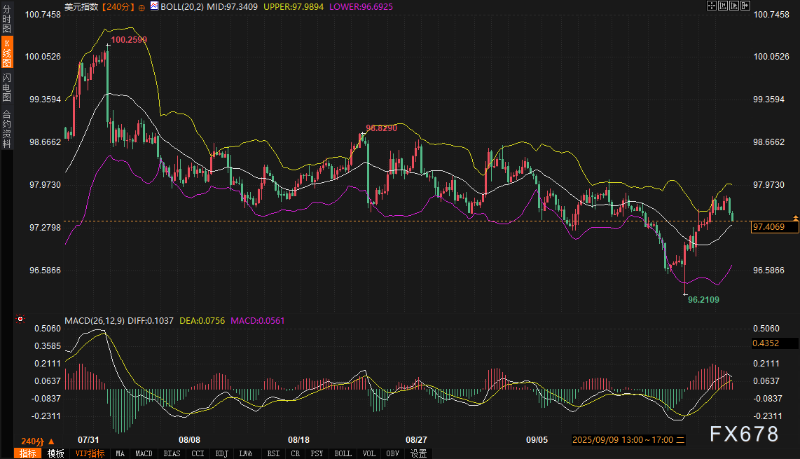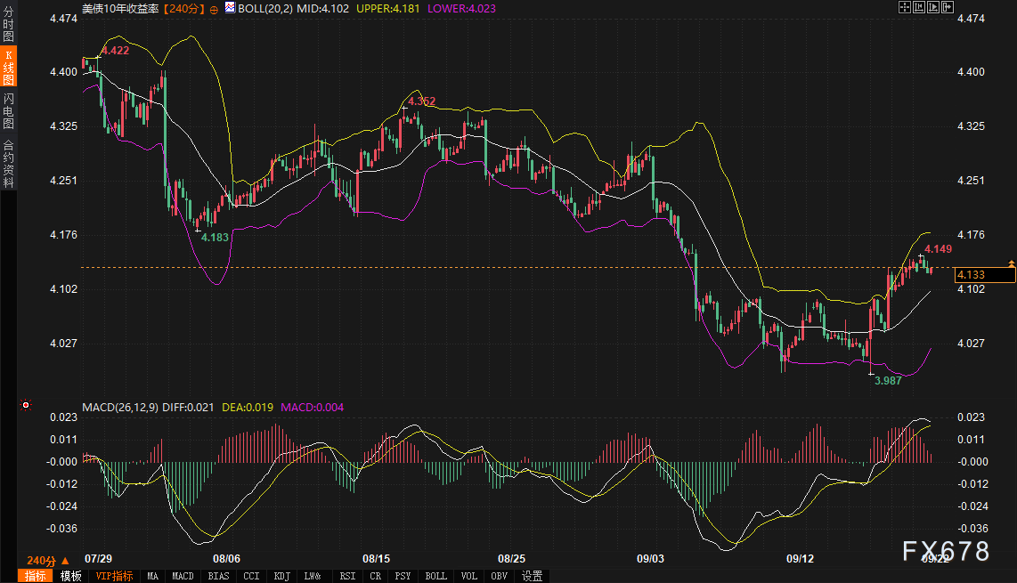 盈凯外汇官网报道——北京时间周一(9月22日),美元指数延续上周五的回落势头,显示出多头动能的初步疲软。同期,10年期美债收益率站上4.131,日内微升0.05%,在布林带中轨上方稳住阵脚,反映出市场对高利率延续的预期渐趋明朗。整体而言,美债收益率的企稳为美元提供了潜在支撑,但短期内美元指数仍受制于前期高点阻力,呈现出震荡回踩的迹象。