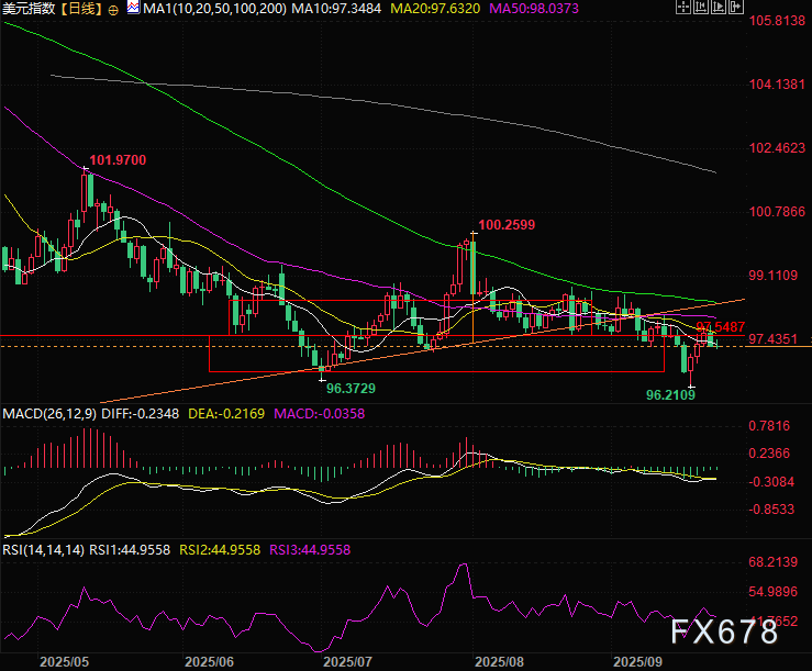 美元指数受制于箱体上沿以及向下倾斜的均线压制,短期反弹势头受限。