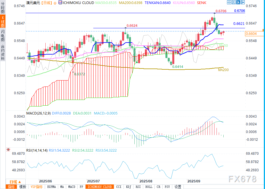 不过,澳元/美元仍维持在50日移动平均线和Ichimoku云图(一目均衡表)上方,且已形成小型“晨星”K线形态——这一形态通常预示着后续可能进一步上涨,有望回升至年内高点0.6700。若该货币对跌破0.6500处的50日指数移动平均线(EMA),则当前的看涨前景将失效。