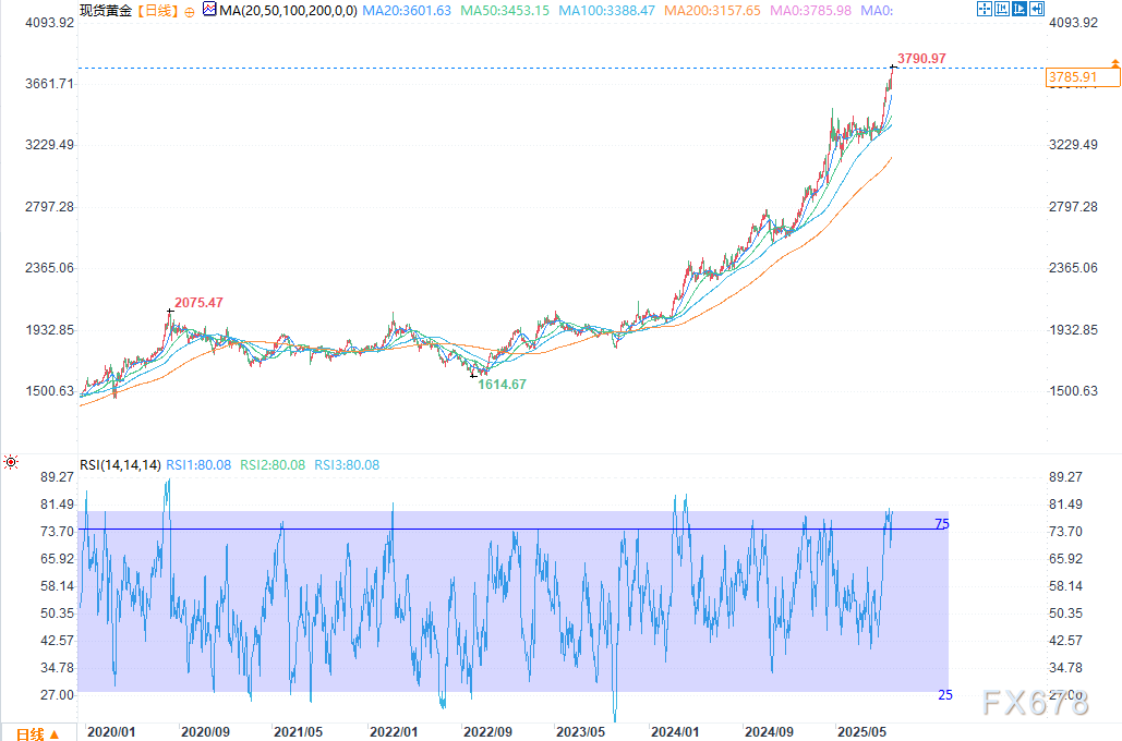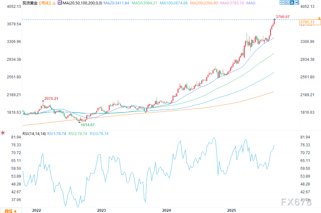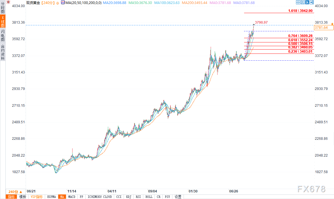 盈凯外汇官网报道——当前,地缘政治紧张局势加剧、避险资产需求上升、股票与加密货币市场风险偏好下降,多重因素共同作用,再次推动黄金价格走高。每盎司黄金现货价格已创出历史高点3790美元;从上周五开盘到周二欧洲市场活跃交易时段,金价累计涨幅超过4%。