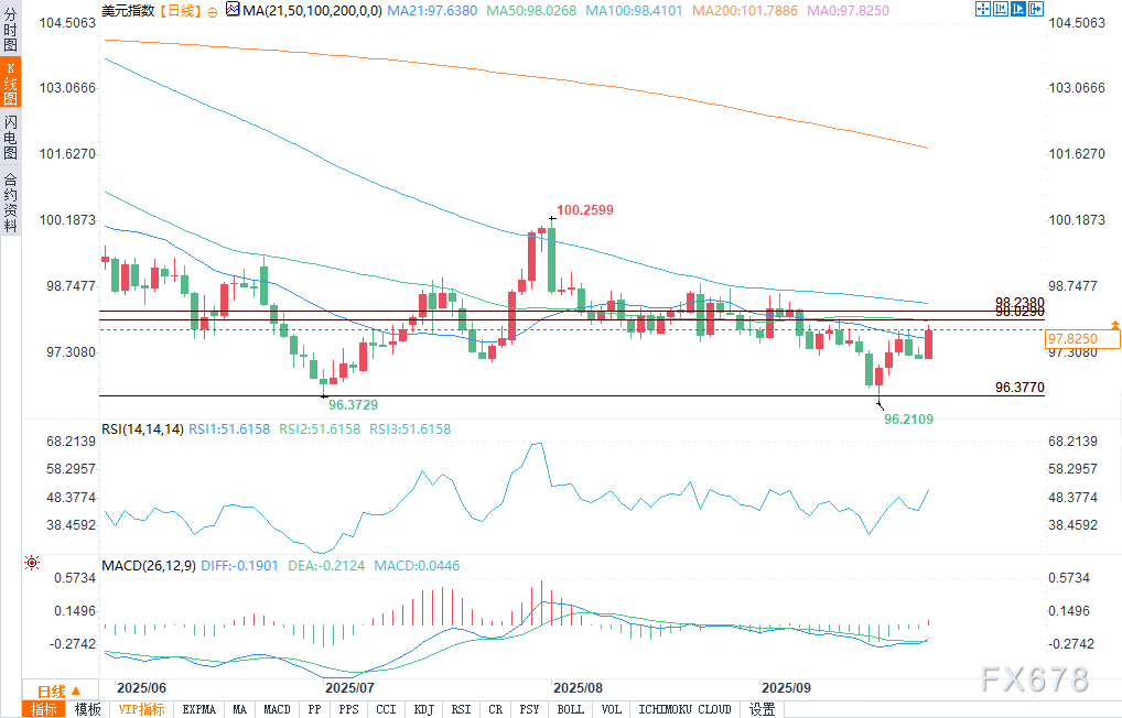 盈凯外汇官网报道——周三(9月24日),美元指数(DXY)大幅上涨,涨幅0.52%,至97.745,逼近关键阻力区间——50日均线(98.029)与50%回撤位(98.238)。在美元指数突破98.635和98.834这两个“双顶形态”之前,上述两个技术指标将是其短期面临的主要阻力。近期支撑位预计为97.199。