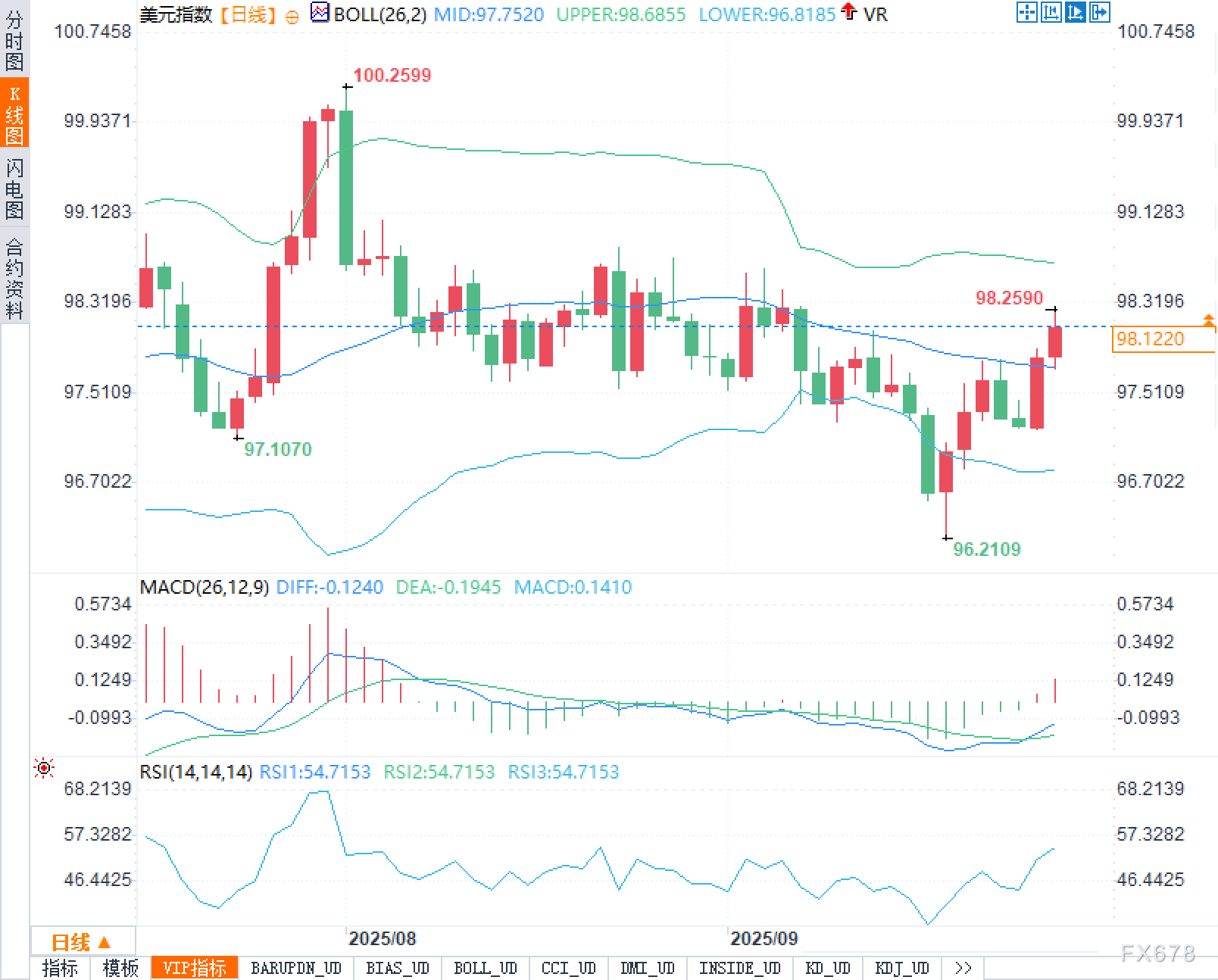 日线图显示,美元指数自96.2109附近低点企稳后震荡抬升,当前围绕布林中轨展开再上攻。布林带中轨97.7520,上轨98.6855,下轨96.8185。现已有效收复中轨上方,正朝98.50阻力发起回测;若日线收于该水平之上,则意味着上攻上轨98.6855的概率增大。