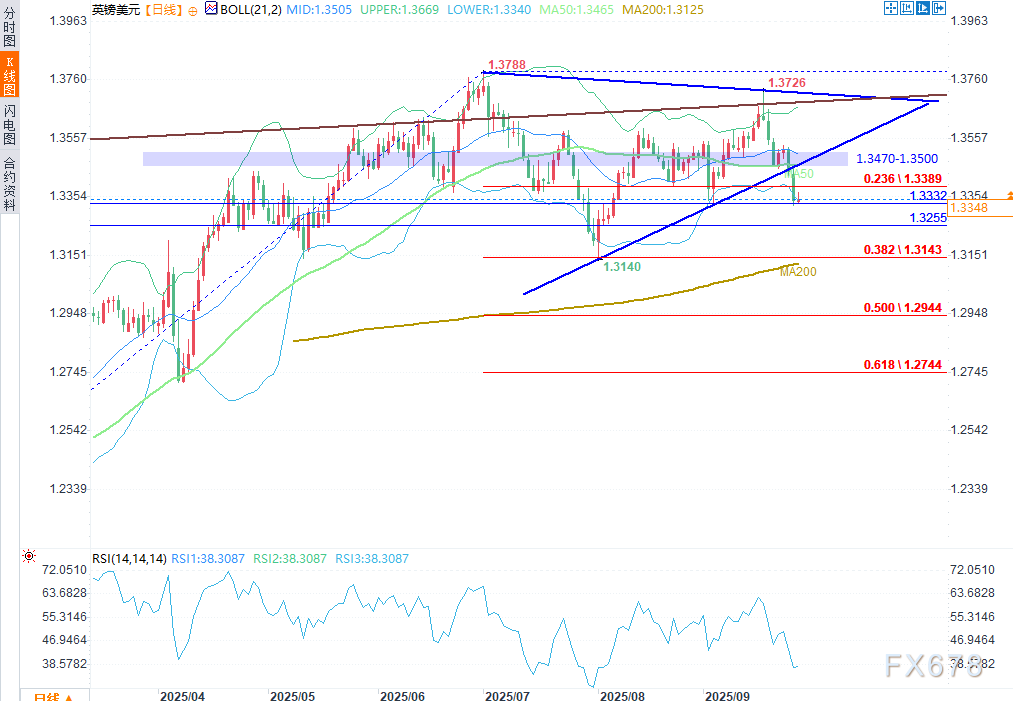 盈凯外汇官网报道——英镑/美元汇率或将跌破移动平均线(SMAs),触及9月支撑位1.3332。短期走势偏向看空至中性,价格或已接近超卖区间。
