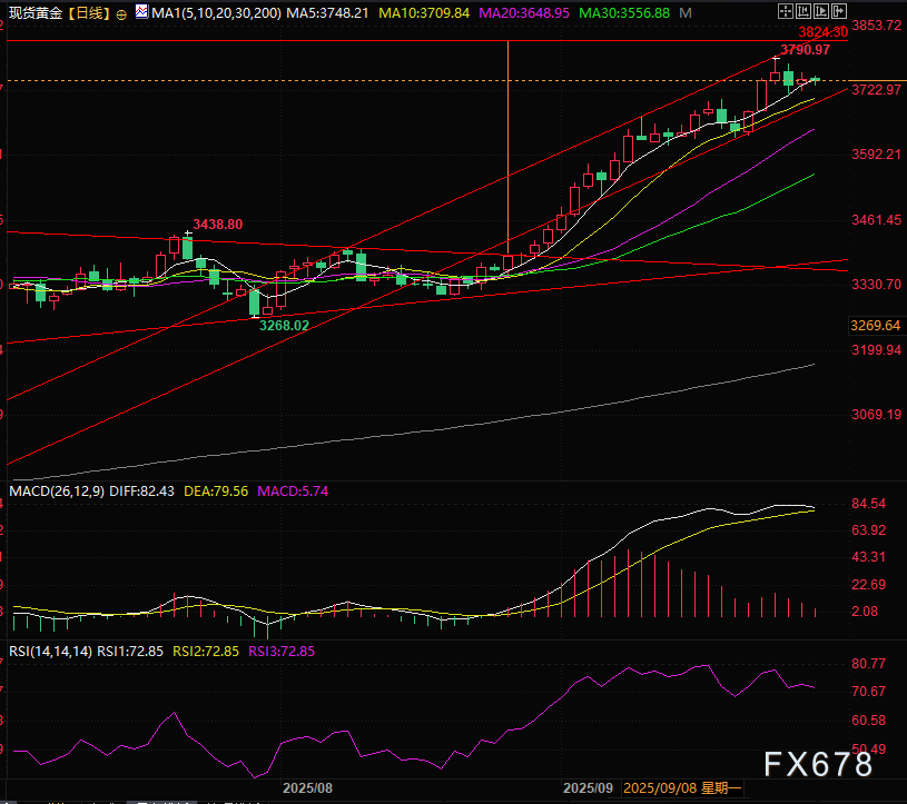现货黄金目前在3740上方摇摇欲坠,日线图多次触碰5日MA后反弹一次弱于一次,市场正在等待今晚8:30美国公布的8月核心PCE物价指数,如果数据高于预期,金价大概率会跌破3740,由于3740是重要关键位,也是最近多头严防死守的点位,如果被跌破金价将去3700附近寻找支撑。