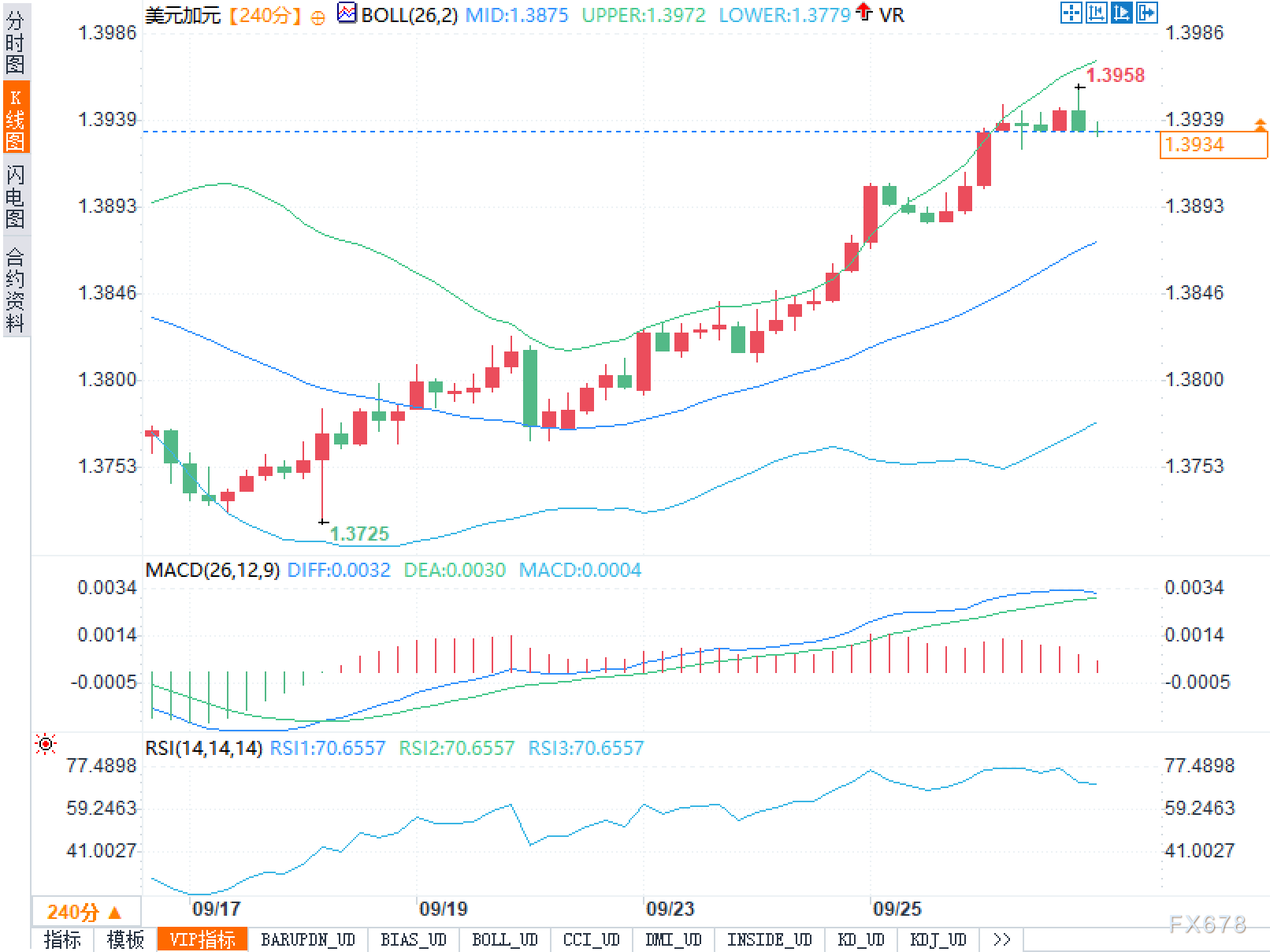 四小时K线显示,汇价自1.3725低点一路抬升,当前运行在布林带上轨附近。布林参数显示:中轨1.3875、上轨1.3972、下轨1.3779,带宽近期温和扩张,提示趋势性胜过震荡性。价格目前贴近上轨并在1.3930—1.3960区间内“高位横盘”,属于典型的“上轨行走”形态;若沿轨上行未被迅速回拉,中短线仍偏向“通道内续攻”。