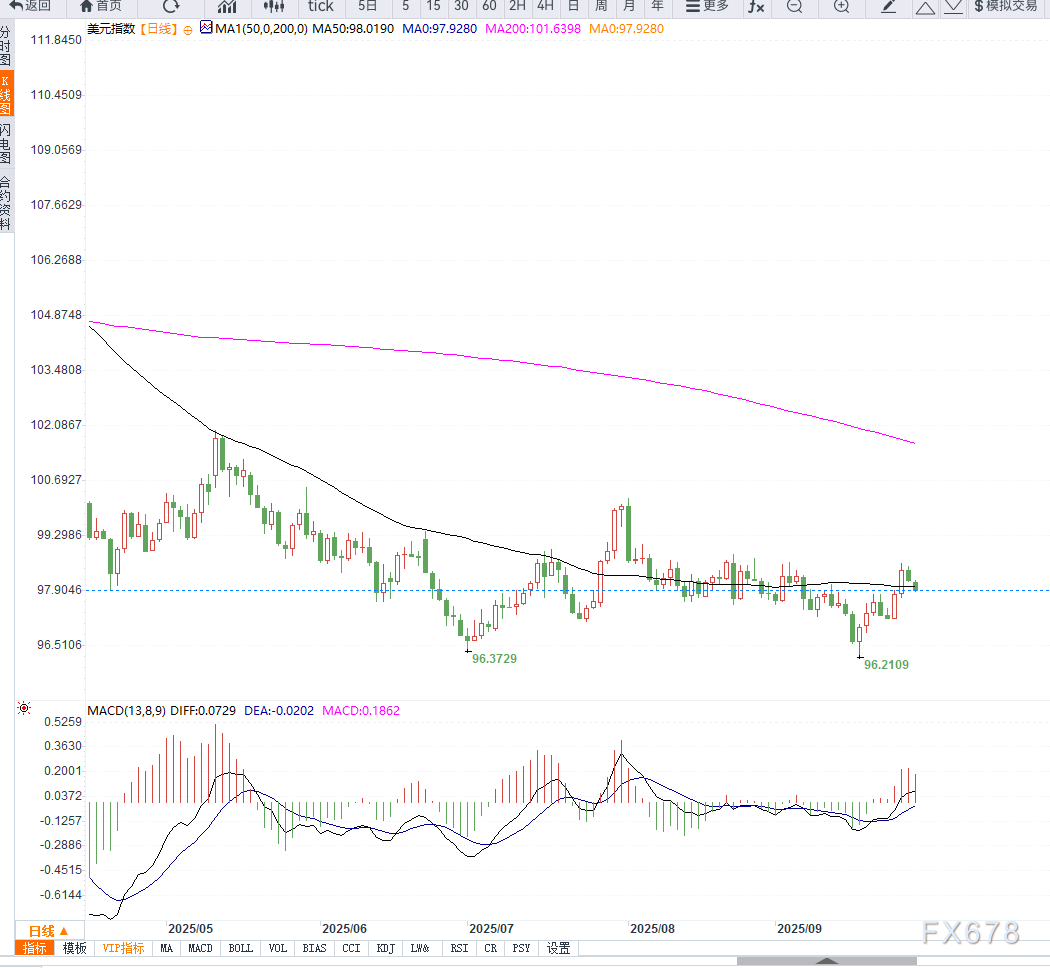 从日线图来看,美元指数(DXY)目前在97.95附近承压整理,短期均线呈现走平状态,显示多空力量暂时均衡。RSI指标接近中性水平,动能偏弱,短线难以出现单边突破。