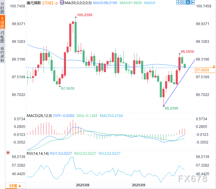 继7月与8月连续两份疲弱就业报告后,市场普遍预期此次数据将延续低迷态势,这可能使美元延续上涨行情面临阻力。加之美元指数日线图上周五形成显著顶部形态,未来数个交易日或面临回调压力。周一(9月29日)亚市时段美元指数延续前一交易日跌势,现交投于97.92附近。