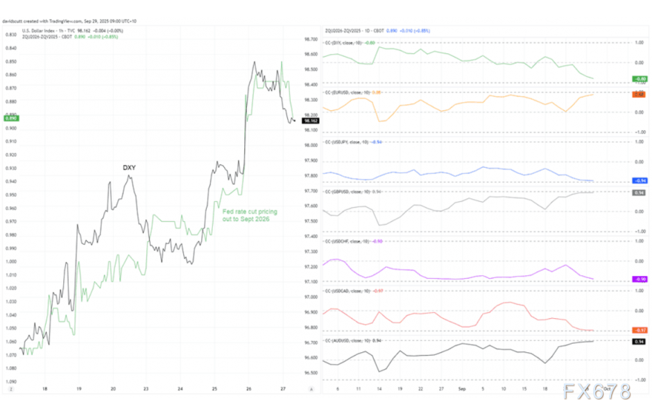 这些数值具有显著统计意义,表明过去两周美元走势与降息预期定价近乎同步——降息预期升温则美元走弱,降息预期降温则美元走强。