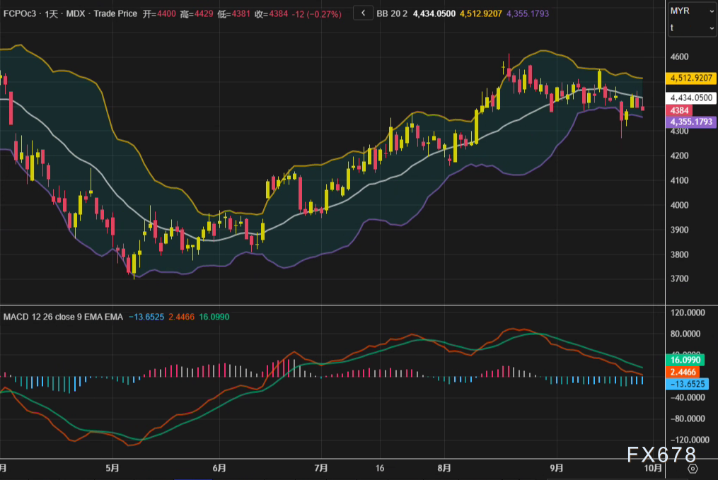 盈凯外汇官网报道——周一(9月29日),马来西亚衍生品交易所基准12月棕榈油期货合约FCPOc3未能延续反弹,在日内震荡后转而收低,最终报收于每吨4384林吉特,较前一交易日下跌12林吉特,跌幅为0.27%。这已是该合约连续第二个交易日收跌。从技术层面审视,日线图上,布林带轨道位于4355.18至4512.92林吉特区间,价格在中轨4434.05林吉特下方运行。MACD指标显示,下跌动能虽仍存在,但其柱状线有所收窄,暗示下行动力可能正在减弱。