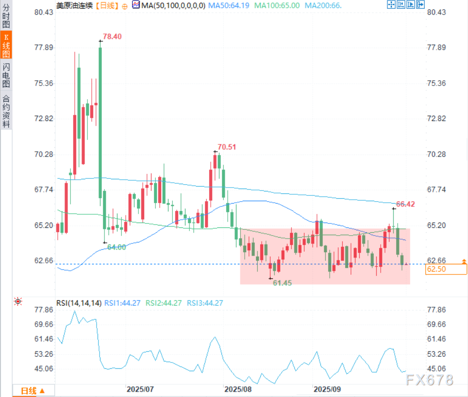总体而言,美原油连续仍维持宽幅震荡格局,在市场出现新催化剂前横盘走势或将延续。若明确跌破61.50美元,下行目标将指向60.00及59.50美元;反之若能持续收复65.00美元并突破上周66.42美元高点,则可能重新测试7月70美元附近的波段高点。