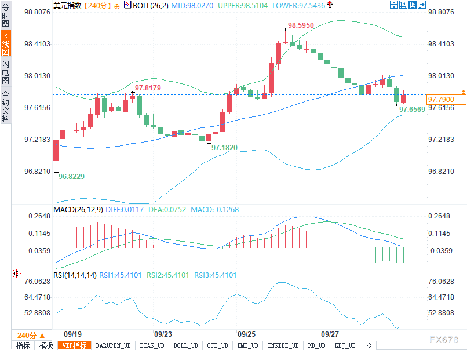 盈凯外汇官网报道——周二(9月30日),美元指数北美时段在98下方徘徊,日内呈“高开回落—弱势横盘”,与前一交易日的温和下行相呼应。当前时点叠加数据密集期:JOLTS职位空缺将在今晚22:00公布,后面焦点则转向非农。