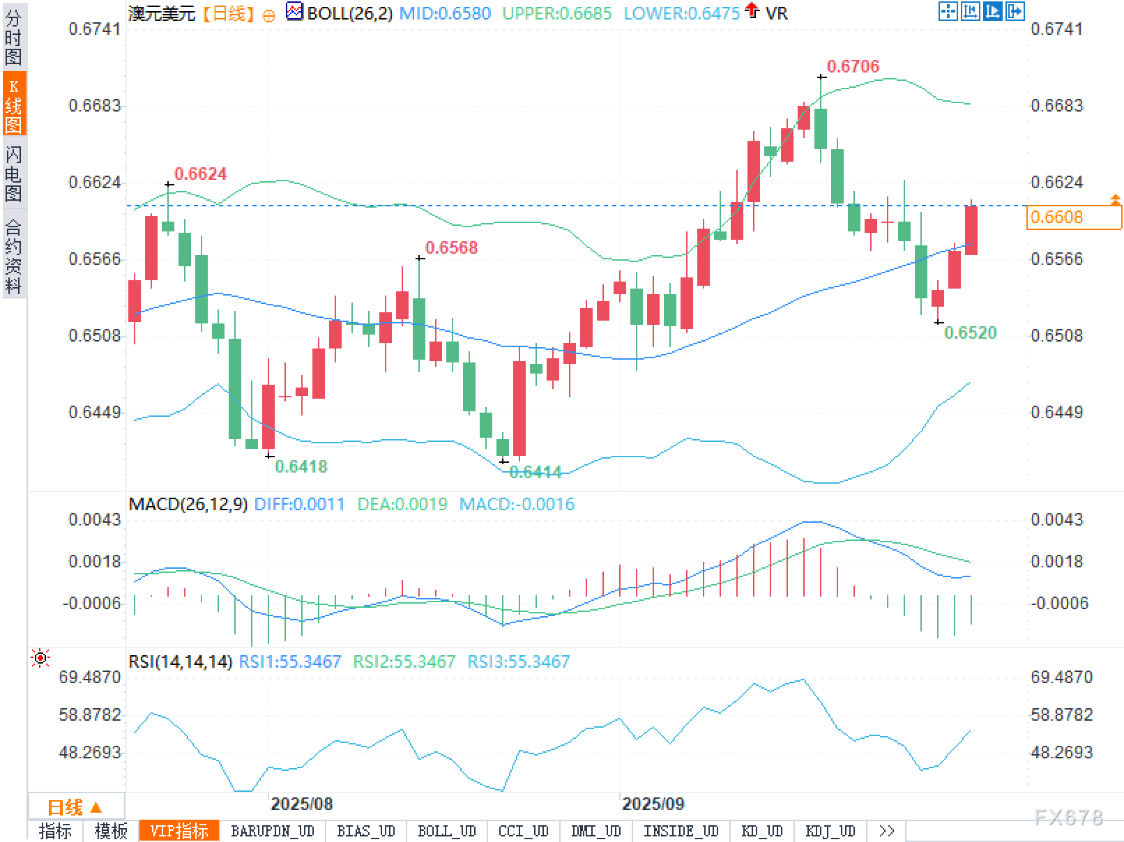 3)澳元端的支撑。RBA在9月会议将现金利率维持在3.6%,但措辞偏鹰:核心通胀下行放缓,且三季度通胀可能高于8月时的预期。此前2025年以来累计已降息75bp,但RBA称仍需时间评估传导效果,这令11月再降息的预期降温。叠加8月通胀同比为近一年最快,澳元利差与通胀预期对汇价形成边际支撑。基本面合力之下,澳元的“反身性”启动:弱美元叙事+RBA的相对鹰派,带动汇价回到0.66之上。