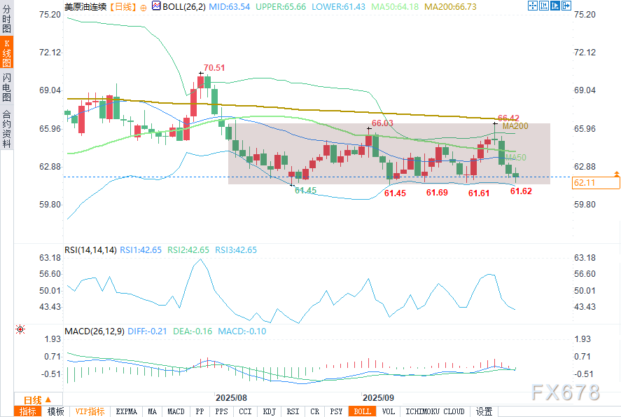 盈凯外汇官网报道——周三(10月1日)欧盘时段,WTI原油期货价格再度下滑,盘中一度触及61.62美元的低点,略高于前期波动底部构成的关键技术支撑区间。该区间从61.61美元延伸至60.77美元,仍是看涨波段交易员的重要防线。然而,油价目前仍明显低于50日平均线(64.18美元)和200日移动平均线(66.73美元),这两条均线目前均已成为强劲的阻力位。