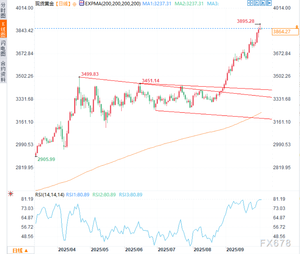周三政府停摆促使投资者纷纷寻求避险交易,金价飙升,一度创下每盎司3895.28美元的历史新纪录。
