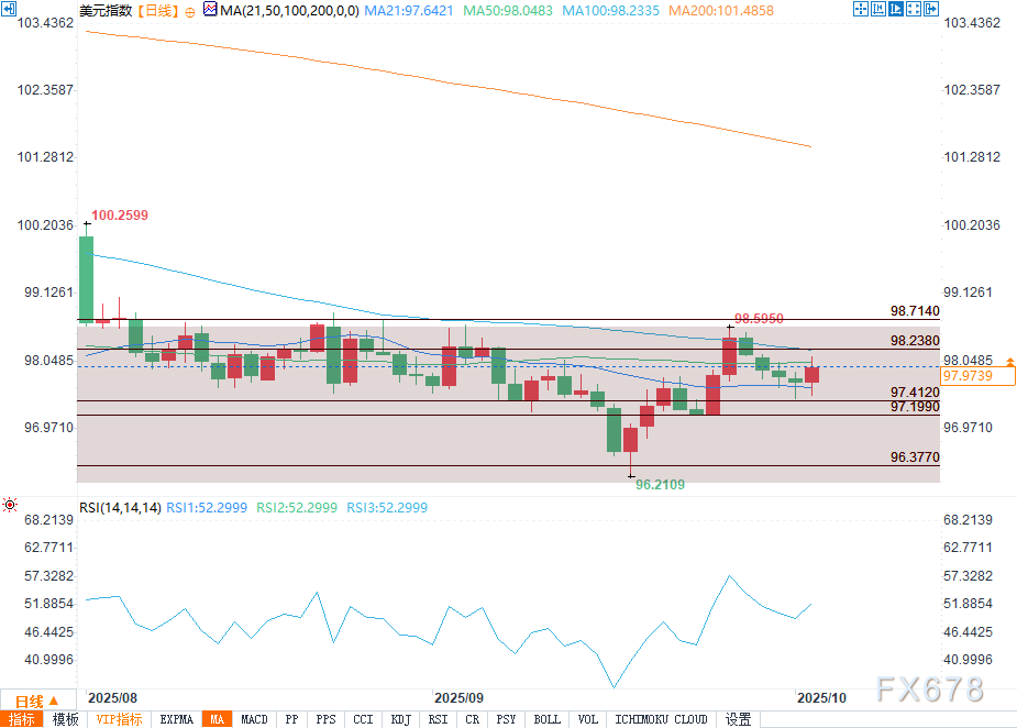 盈凯外汇官网报道——周四(10月2日)美盘时段,美元指数(DXY)承压下行,跌至97.522的近一周低点。这一走势源于市场消化美国疲软就业数据及持续政府停摆的影响。然而,早盘中段美元开启回升走势,尽管反弹背后并无明确基本面驱动因素,指数仍短暂转涨。