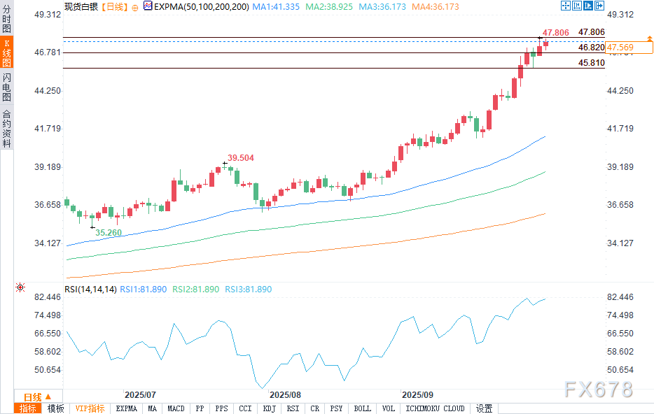 目前白银多头仍掌握主动权,但上涨动能取决于能否有效突破47.81美元。若黄金突破3895.50美元且美元进一步下滑,白银可能加速向50.00美元迈进。需警惕的是,若46.82美元支撑位失守,短期趋势可能转向下行。