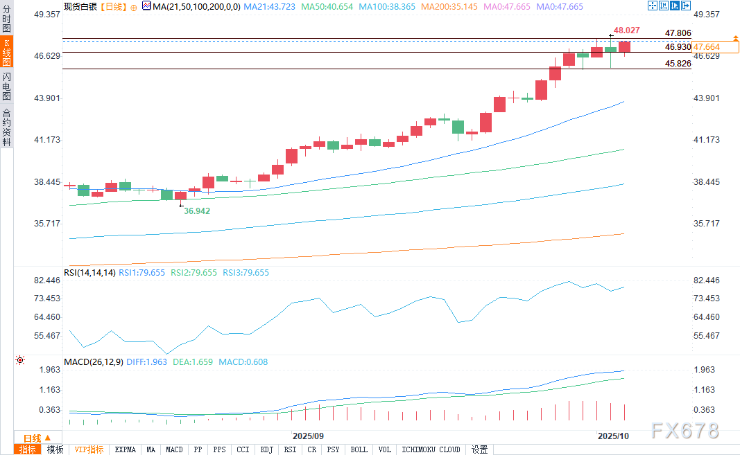 盈凯外汇官网报道——周五(10月3日)欧盘时段,现货白银走势坚挺,价格维持在关键技术支撑位46.93美元上方,多头正计划再次冲击48.03美元的多年高点。尽管美国国债收益率因政府数据发布暂停而小幅走高,但市场对美联储短期降息的信心增强、美元走弱,为白银提供了支撑。