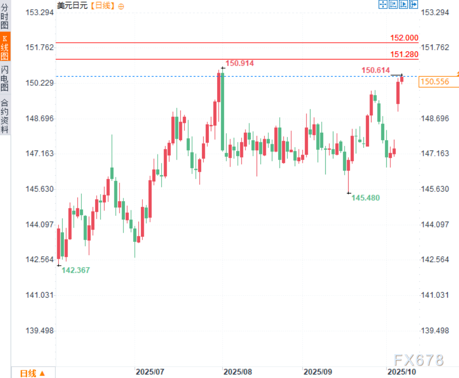 市场还将关注非农就业数据以研判美联储政策前景——若数据疲软可能强化对10月与12月连续降息的预期。但目前而言,回调行情更可能吸引买盘,市场焦点集中于对151.28双顶高位的再度测试。