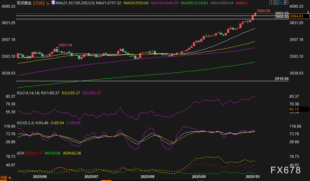盈凯外汇官网报道——周二(10月7日)美盘时段,现货黄金延续历史性涨势,盘中触及近3991美元的历史新高。受美国政府长期停摆、市场对美联储进一步降息预期升温影响,投资者纷纷转向避险资产,推动这一贵金属价格上涨,反映出市场焦虑情绪不断加剧。