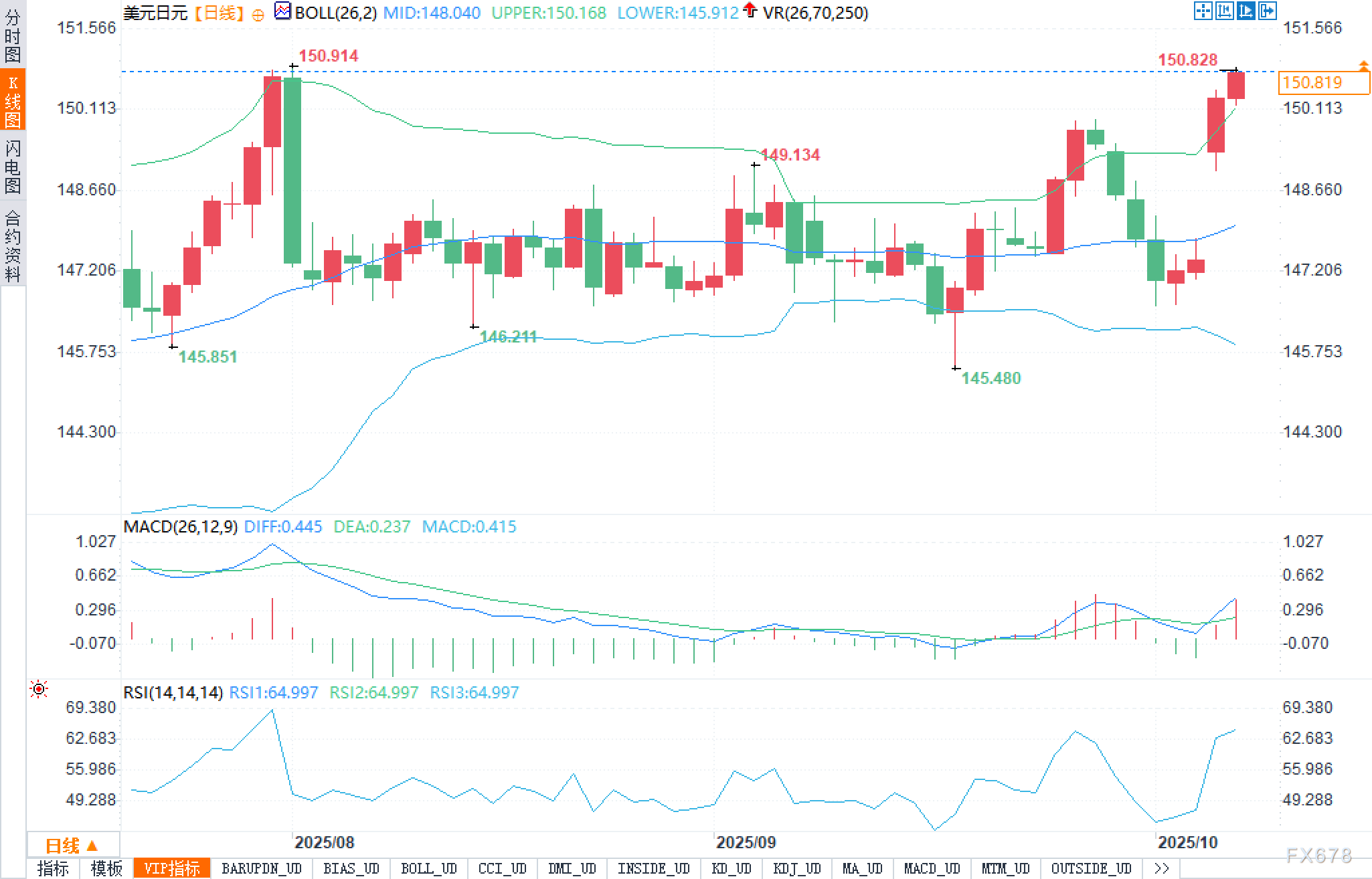 盈凯外汇官网报道——周二(10月7日),欧洲时段美元兑日元延续走强至150.50上方。汇价跟随美元整体上涨而抬升;与此同时,日元继续明显跑输主要货币,市场围绕日本新任首相高市早苗的政策取向重估日本央行的后续路径。