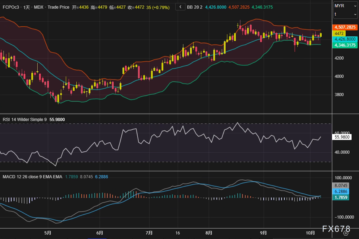 盈凯外汇官网报道——周二(10月7日),马来西亚棕榈油期货结束两日连跌,主力合约FCPOc3收报4472林吉特/吨,单日上涨35林吉特,涨幅0.79%。技术面上,布林带上轨位于4507林吉特附近,MACD柱状线收于6.29,快慢线呈多头排列,显示短期动能转向积极。