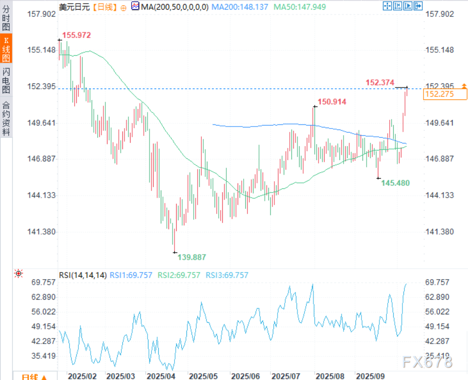 盈凯外汇官网报道——短期来看,日元正经历一段艰难时期。周三(10月8日)美元兑日元连续第五个交易日走高,本周涨幅逾3%,显示美元兑日元持续走强,亚市早盘时段一度达到二月以来的最高点(152.43)。目前,由于日本新领导层提出的财政政策存在不确定性,看涨动力依然强劲。这种不确定性导致日元持续承压,只要这一前景不变,未来几个交易日美元兑日元的买盘压力可能继续增强。