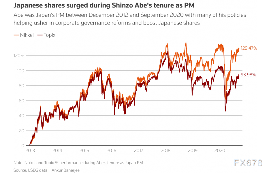 在他掌权的近八年时间里,日经指数.N225上涨了一倍多。外界认为他的政策有助于公司治理改革,提振日本股市自此后屡创新高。