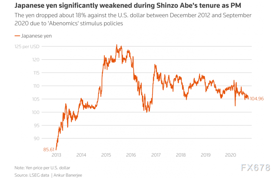 另一方面,日元同期贬值约18%,日元兑美元在2012年12月安倍上任时为86,到2020年9月他卸任时略低于105。