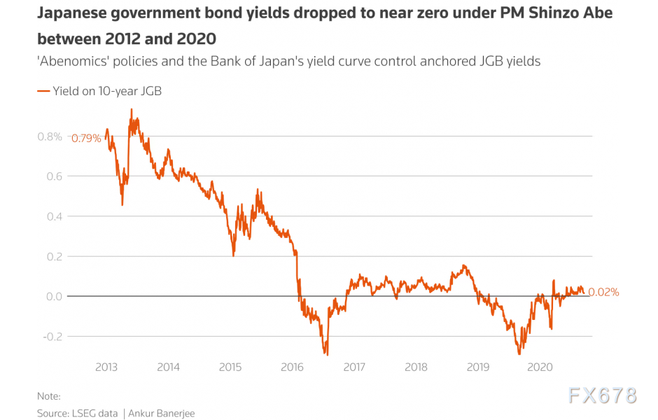 在安倍任内,日本国债收益率下滑至接近零水平。多年巨额购债未能刺激通胀,日本央行随后于2016年1月将短期利率降至零以下,以应对不乐见的日元升值。