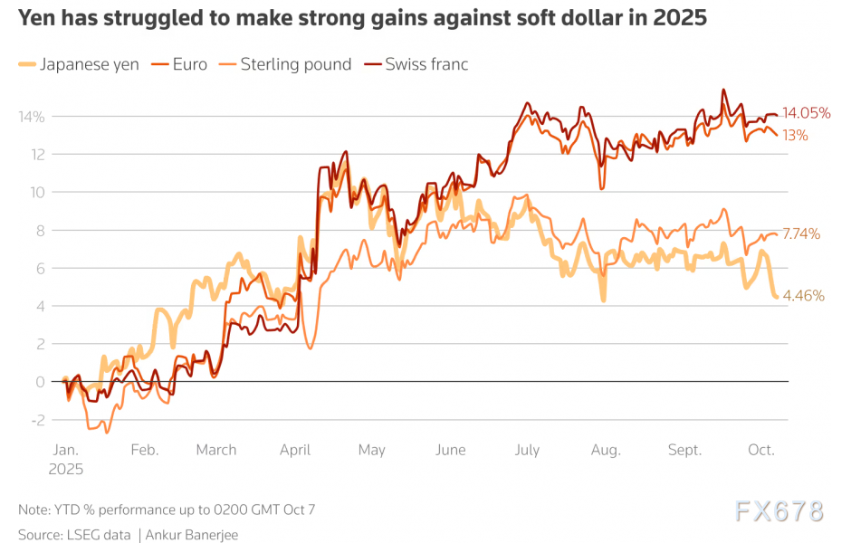 日元在2025年只上涨了逾4%,在主要货币中涨势滞后,未能利用美元疲弱的机会,因日美关税谈判旷日持久,央行又持谨慎态度,不愿仓促加息。