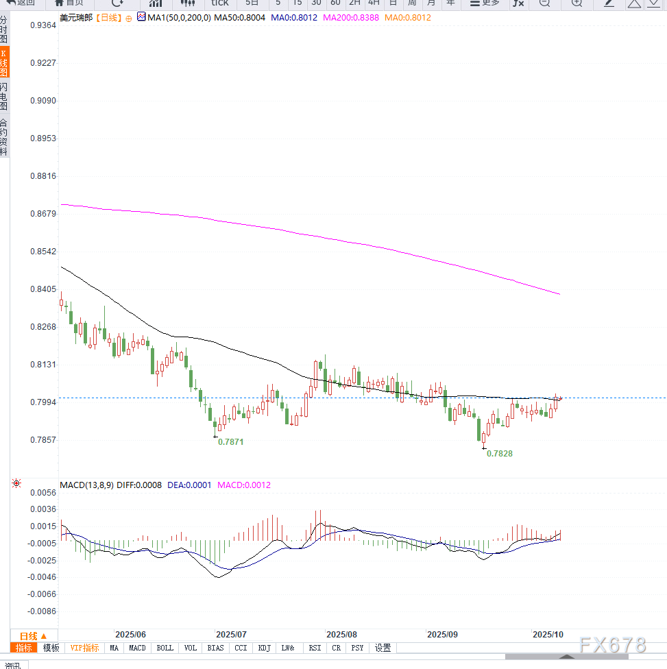 上方阻力位在0.8030(月内高点)及0.8050–0.8060区间,若突破,可能重拾反弹趋势。整体来看,美元承压拖累USD/CHF回调,但仍需关注美联储讲话及关键技术位突破,以判断后续走势。